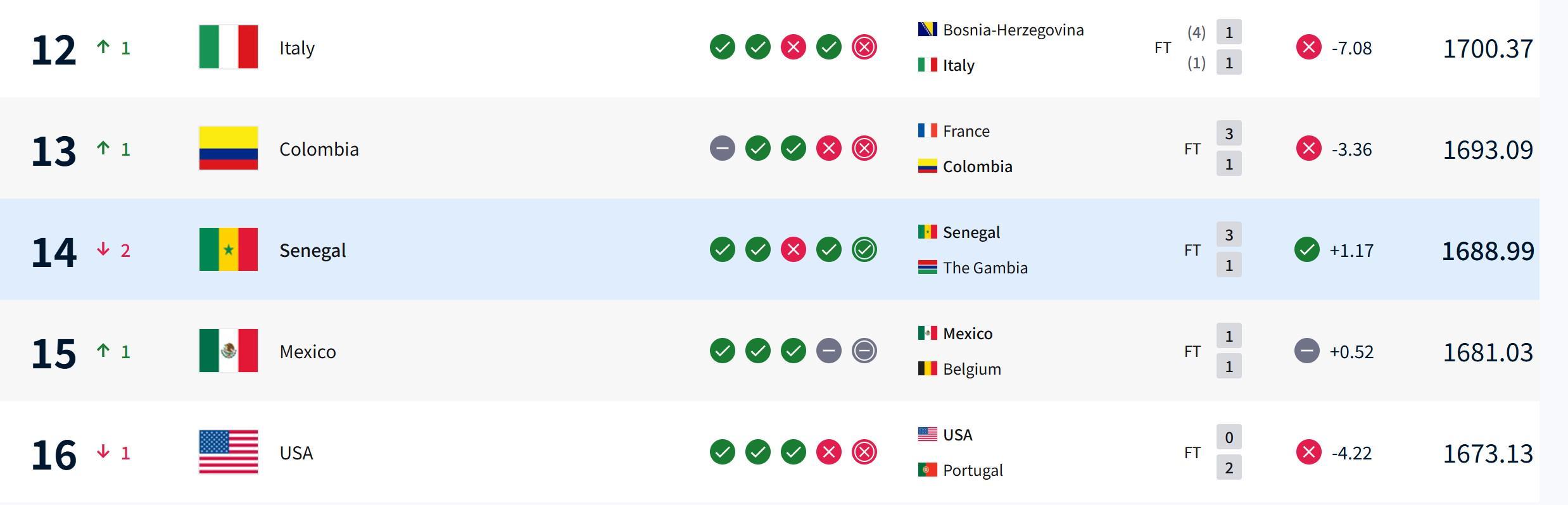 而意大利队这边,尽管球队不敌波黑损失了7.08分,但因为身前的塞内加尔队失分更多,因此得以上升排名。